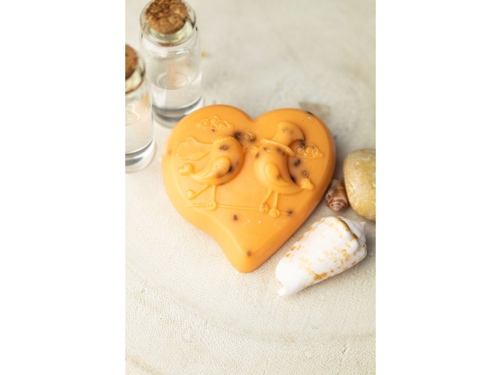 Mýdlo oranžové – s bambuckým máslem, vůní mandarinek a peelingem z květů ibišku. Šíře mýdla 7 cm.
