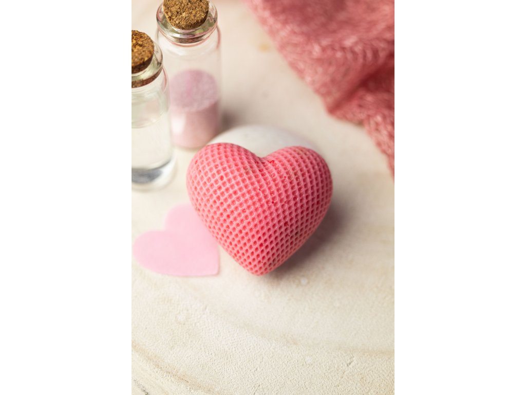 Mýdlo růžové – s bambuckým máslem, malinovým olejem, vůní malin a peelingem z malinových zrníček. Šíře mýdla 5 cm.