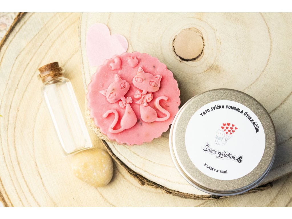 Ručně vyráběná svíčka s průměrem 6 cm. Motiv Kočka se srdíčky.